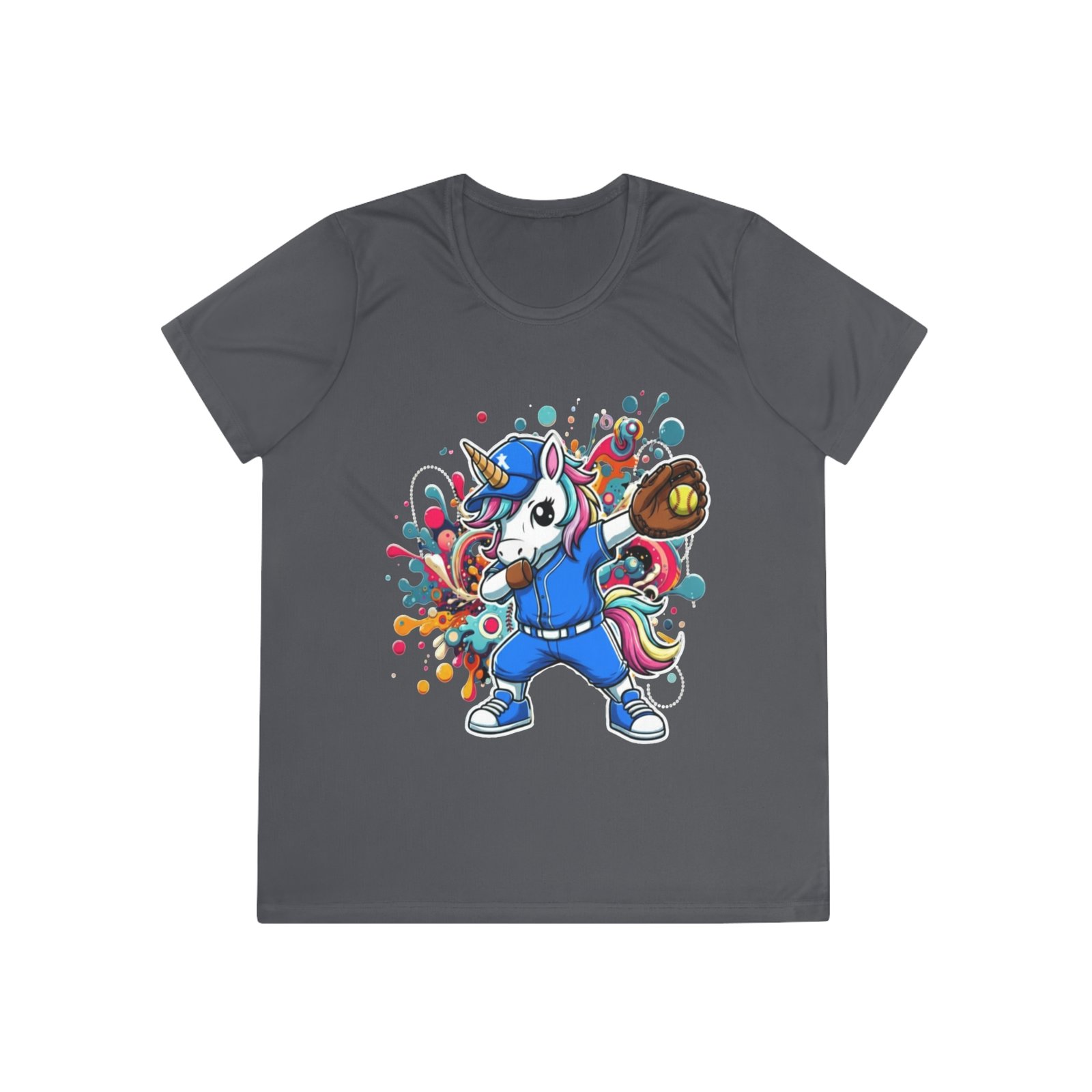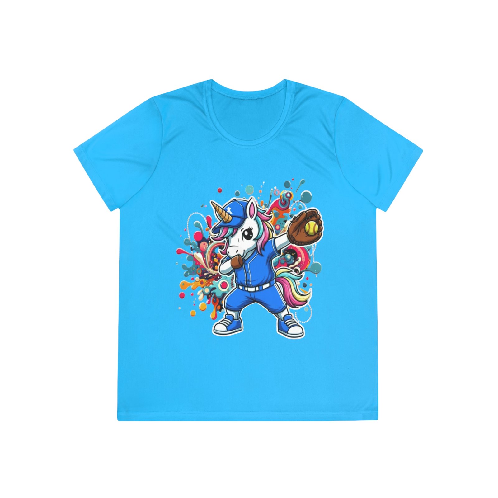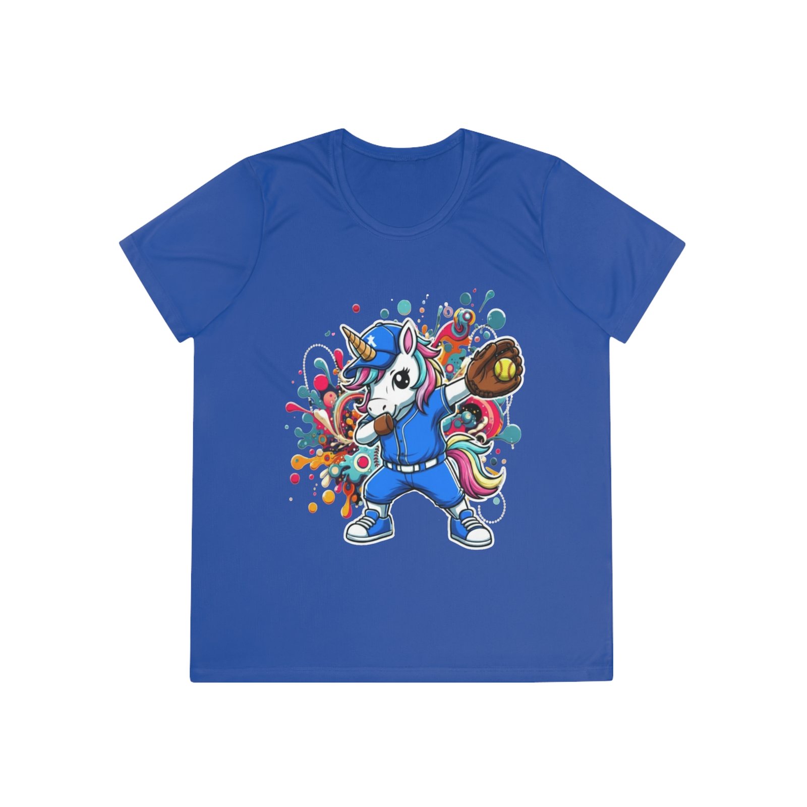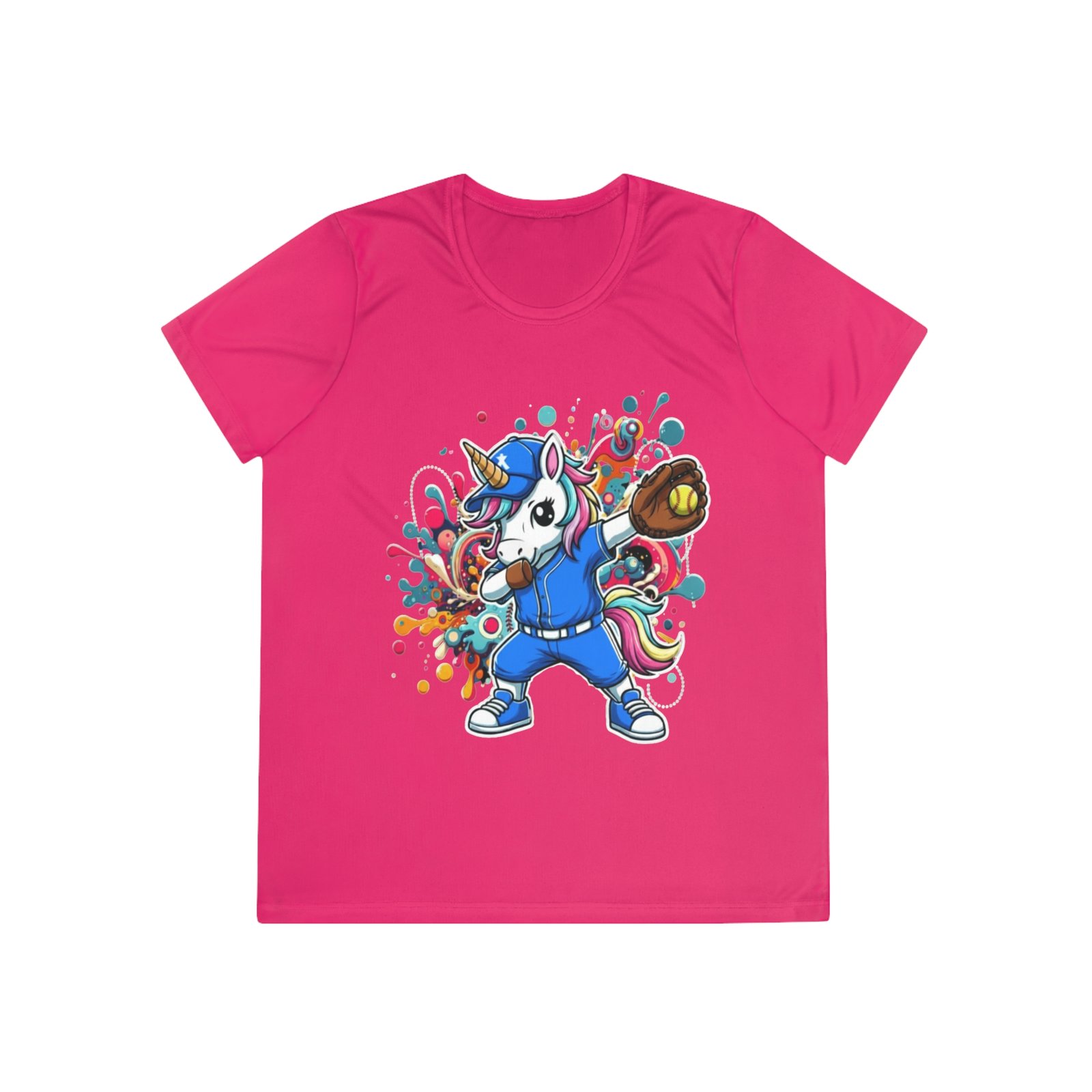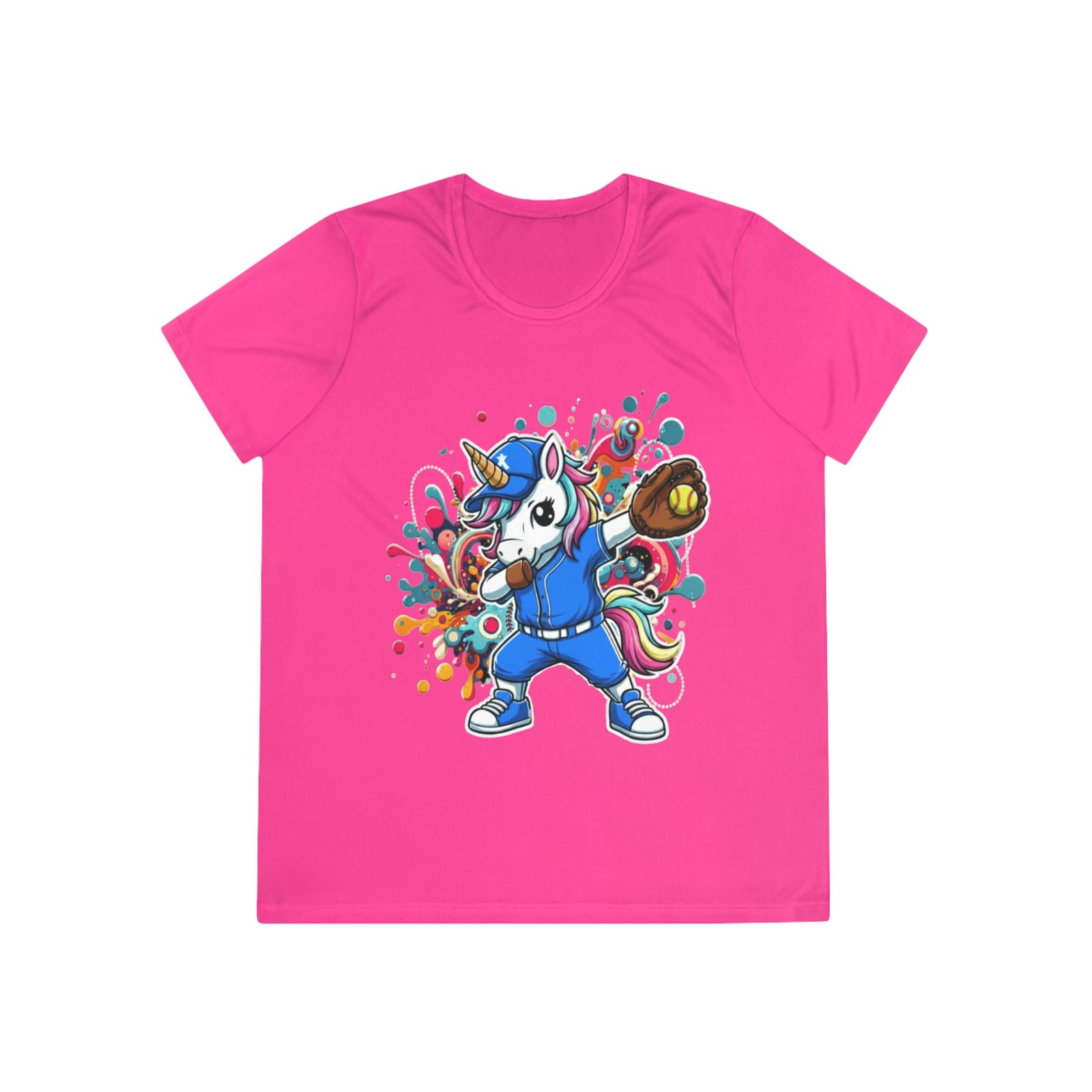 Ladies Softball Unicorn Moisture Wicking Shirt — Dabbing Unicorn with Glove for