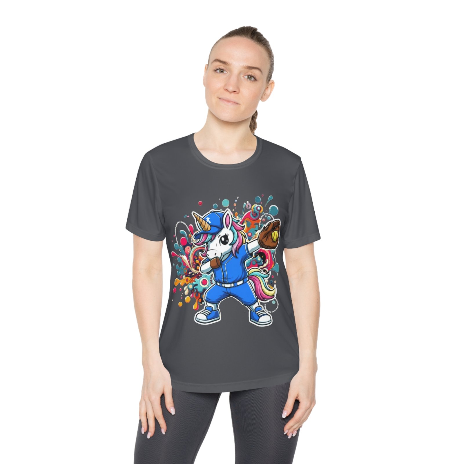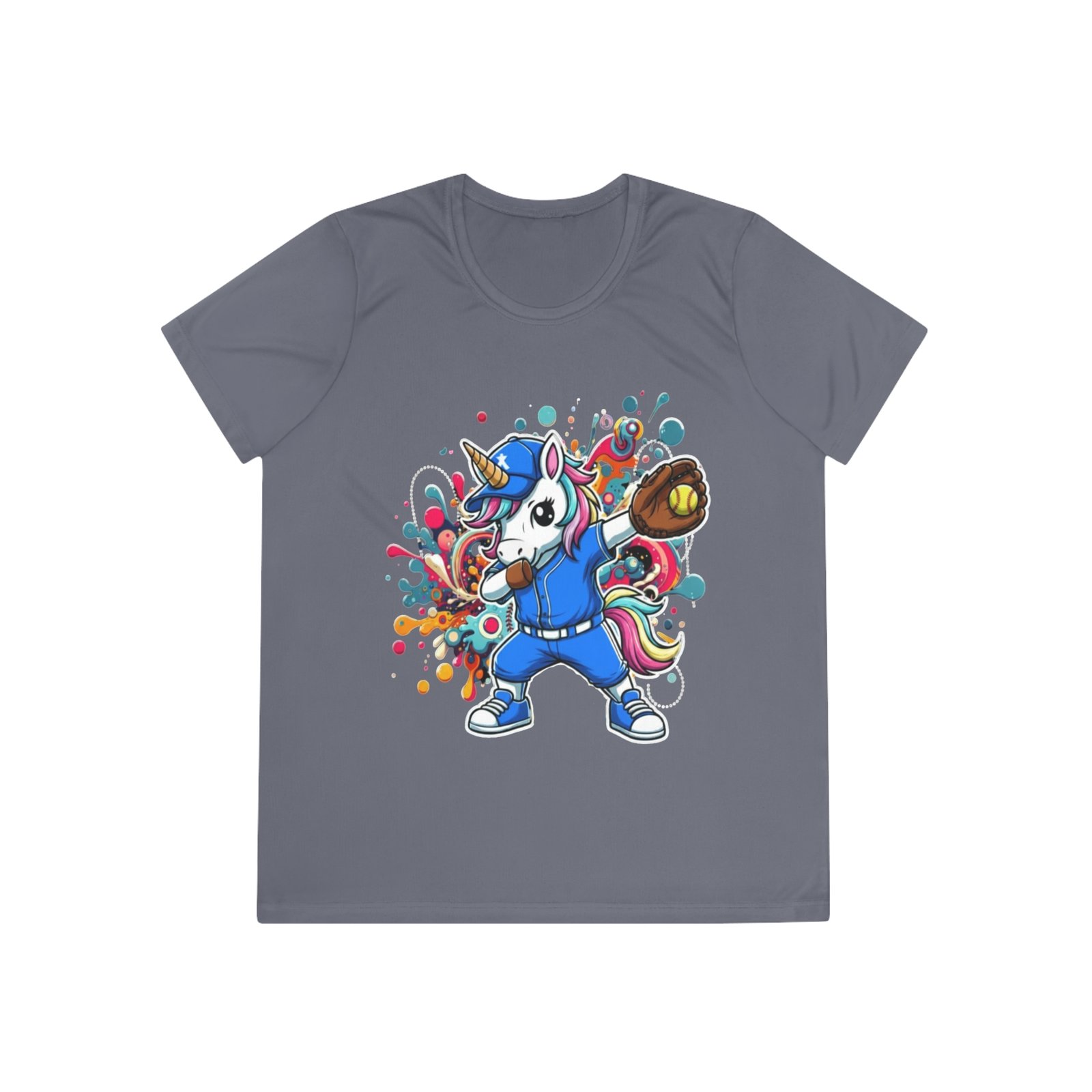Lightweight and lively, this feminine-fit tee brings playful energy to the field. The breathable, moisture-wicking polyester keeps you cool through movement, while the vivid DTF artwork—a colorful, sporty unicorn mid-throw—stays bold wash after wash. Extra-light fabric and a tear-away label make it comfortable for long days of practice, travel, or casual hangouts. Double-stitched hems add durability so the shirt keeps shape and looks fresh even after repeated use. Wear it to add a splash of fun to workouts, team days, or weekend errands.
