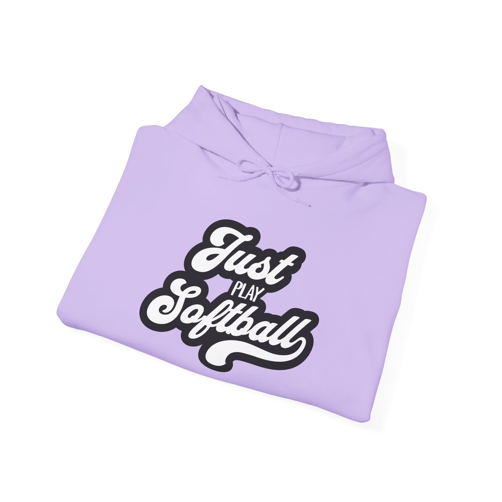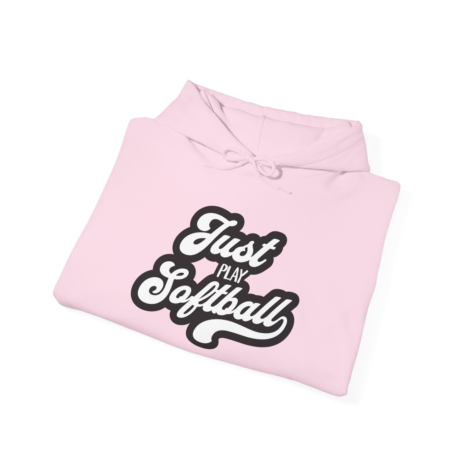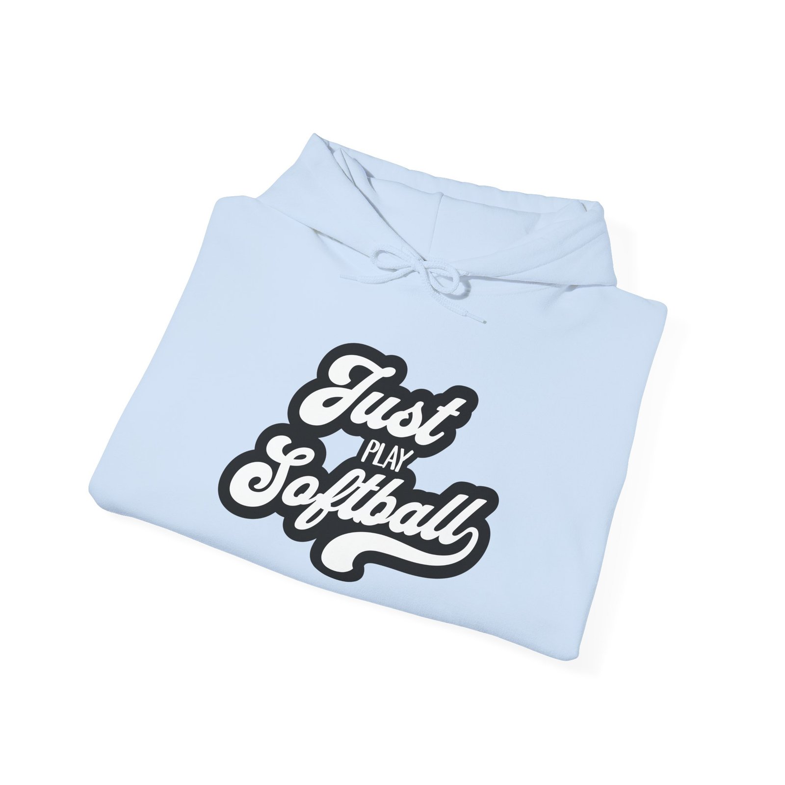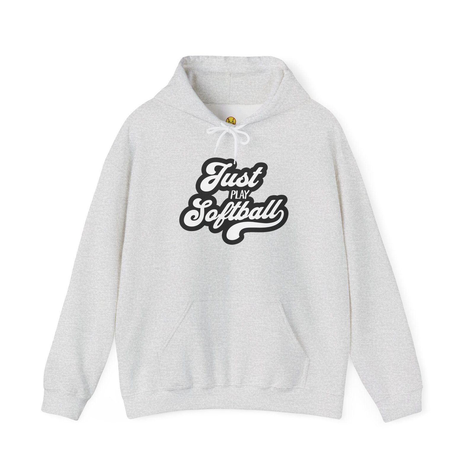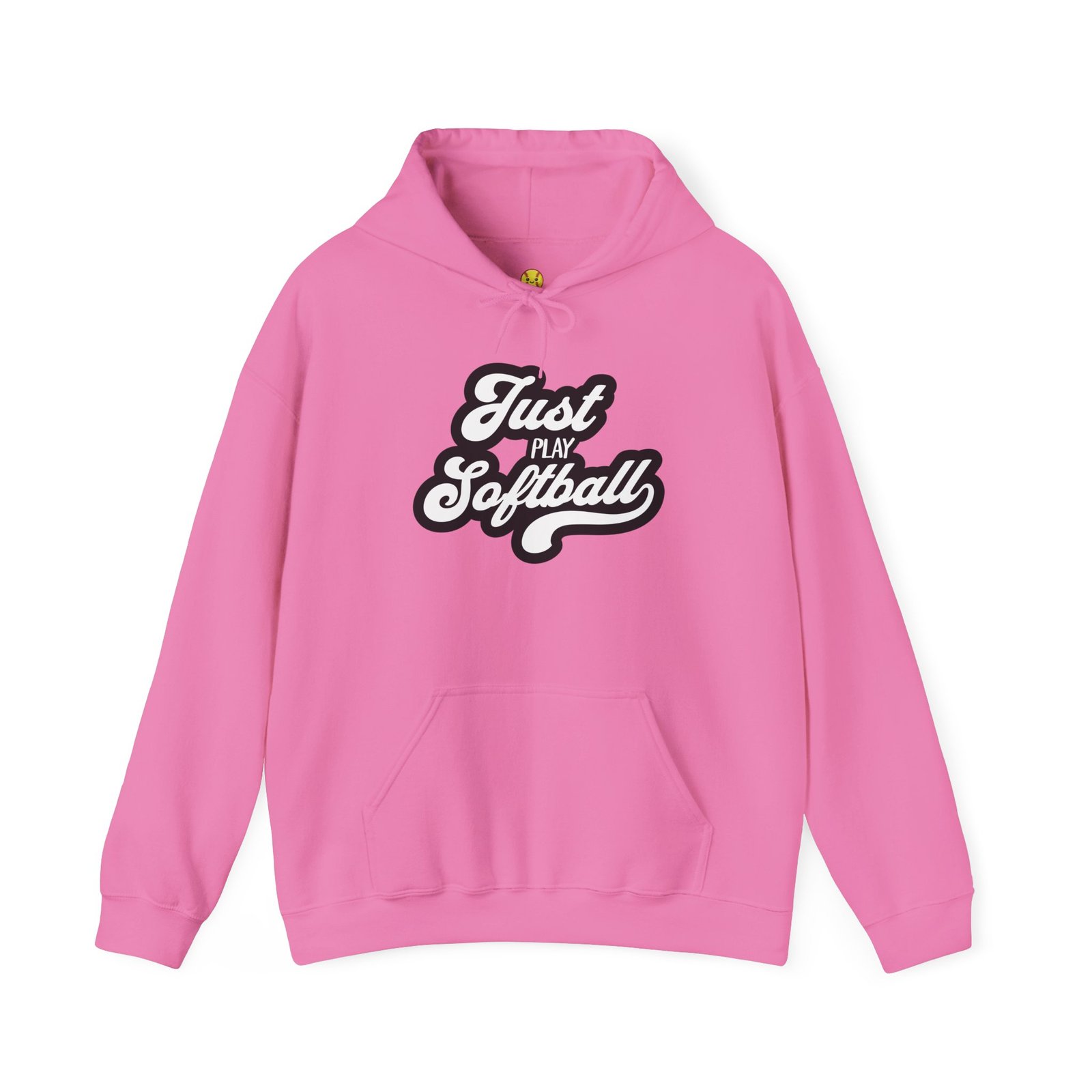 Softball Hoodie – “Just Play Softball” Retro Script Hooded Sweatshirt