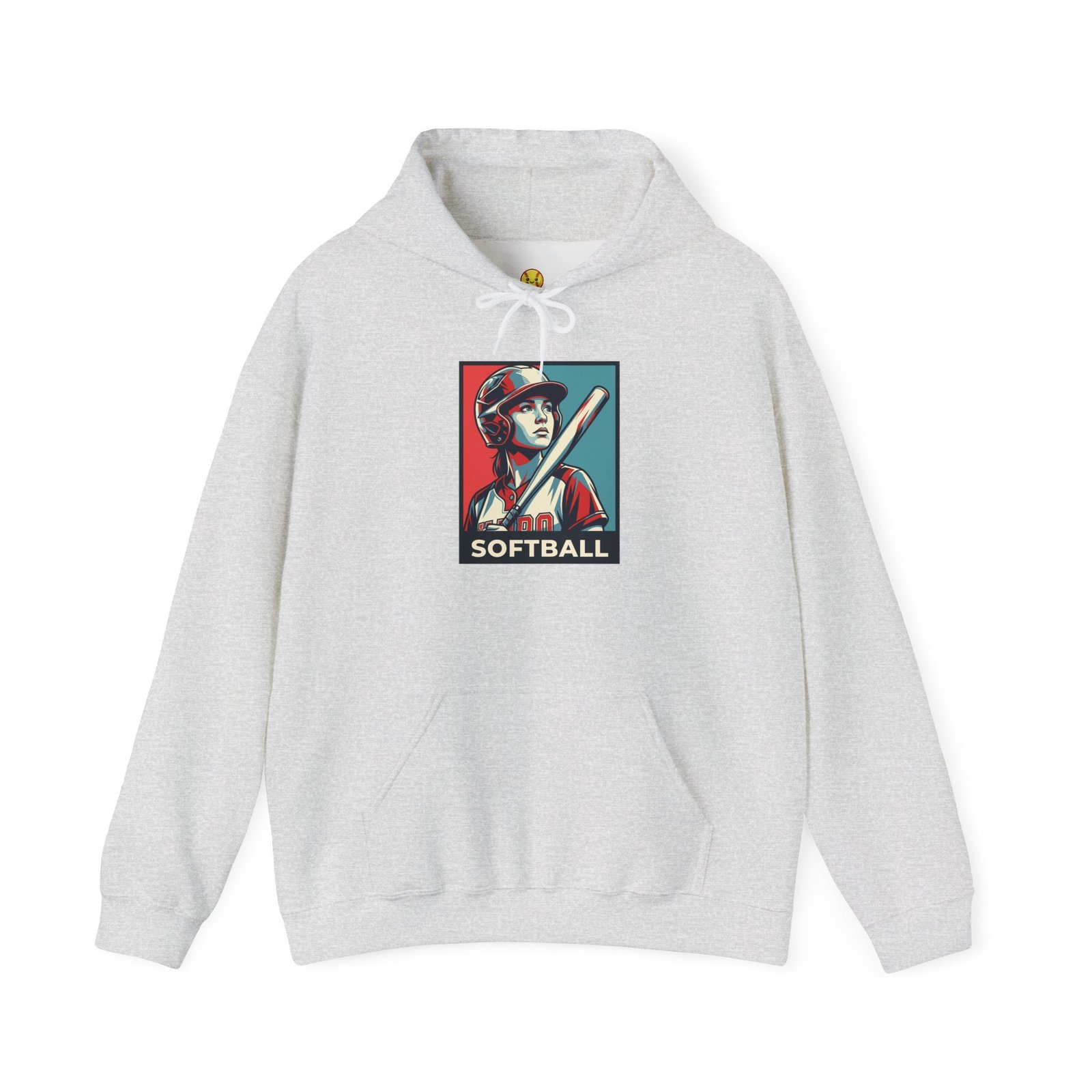 This cozy hooded sweatshirt channels vintage sports pride with a bold, poster-style softball graphic at the chest. The mid-weight 50/50 cotton-poly blend feels soft against skin while keeping you warm on chilly practices, sidelines, or weekend hangouts. A double-lined hood with color-matched drawcord and a roomy kangaroo pocket make it easy to stash gloves, snacks, or chilled hands. The classic fit and tear-away label keep movement comfortable and irritation-free. Whether you’re warming up before a game, cheering from the dugout or watching the game from the stands, this sweatshirt carries a confident, retro athletic vibe that speaks to players and fans who love the game.