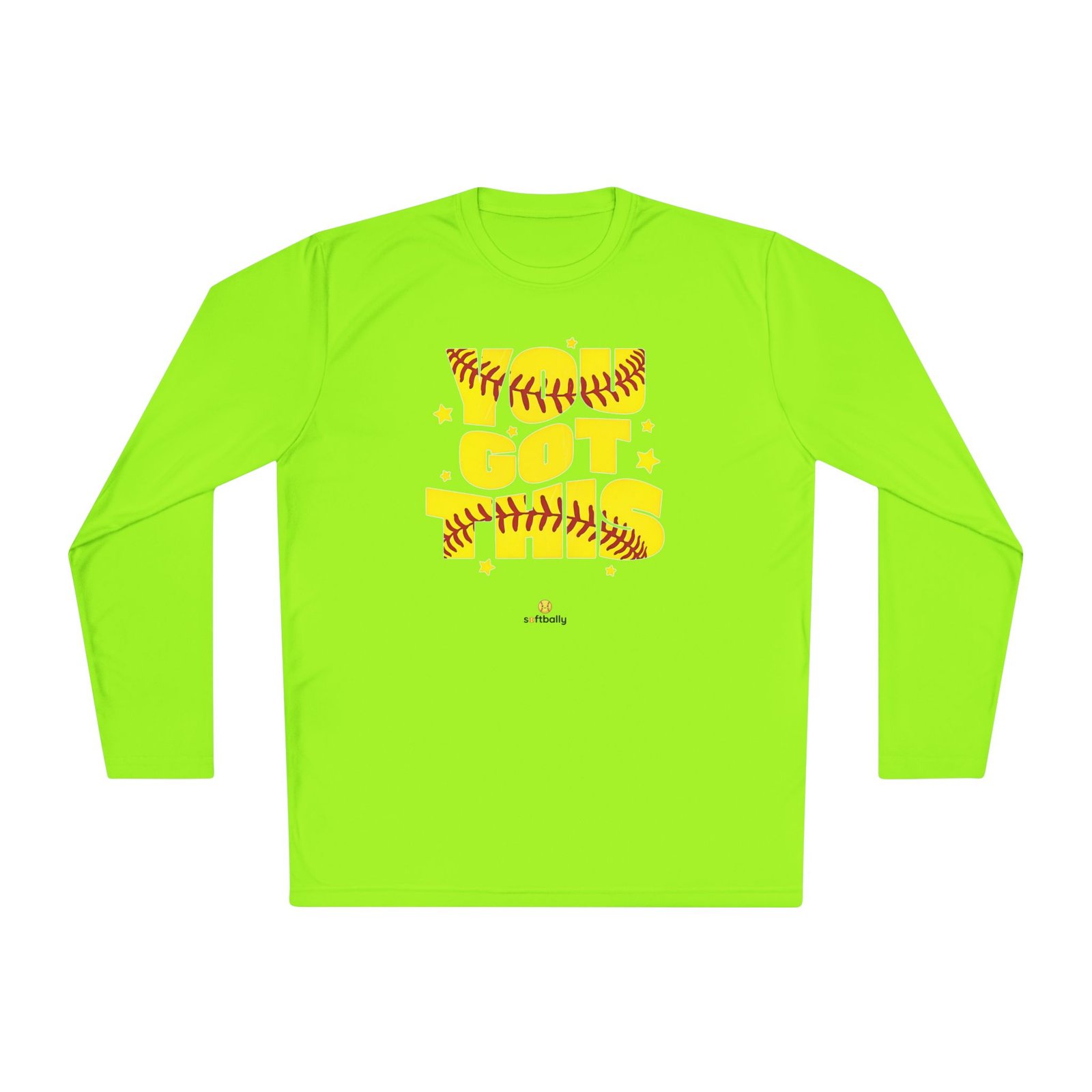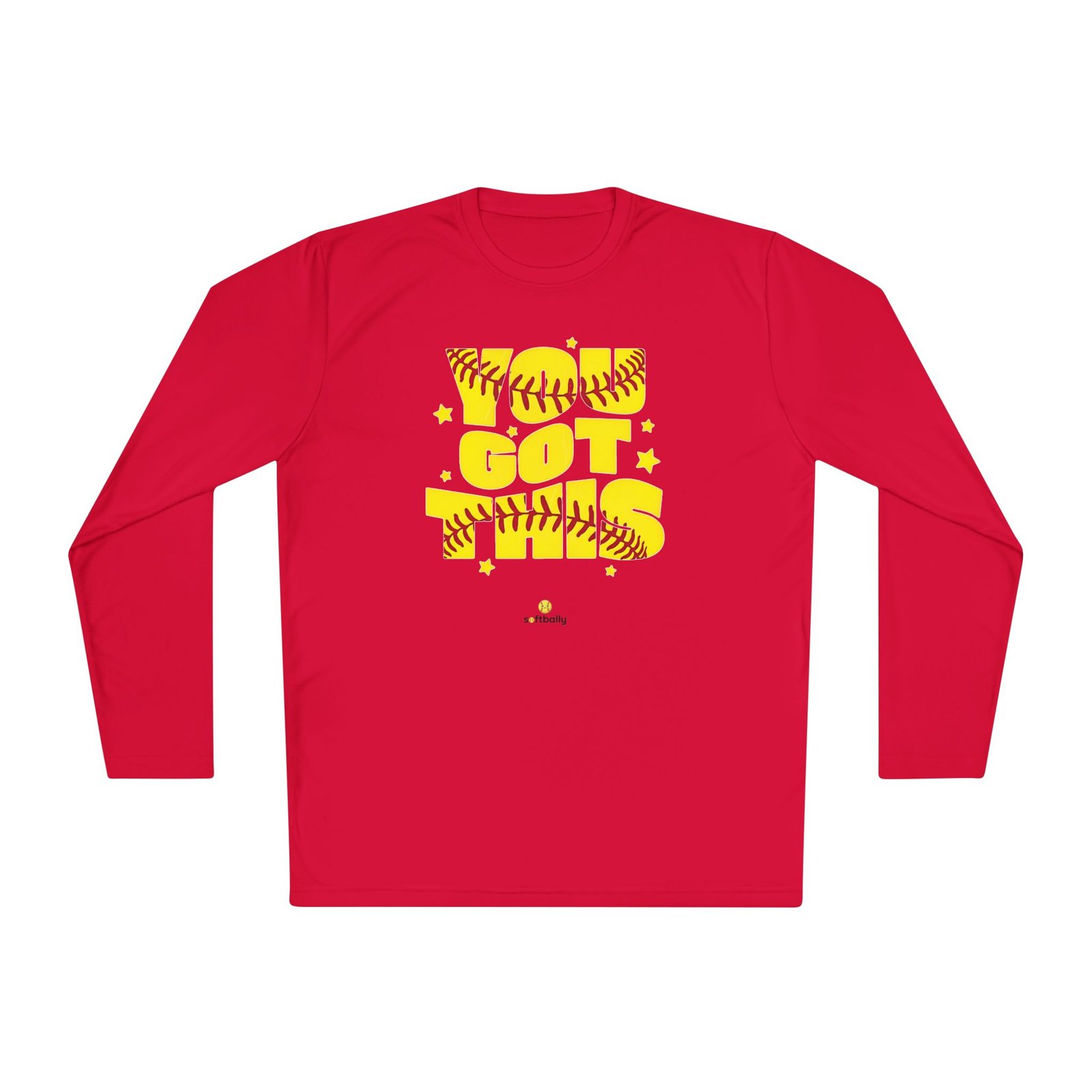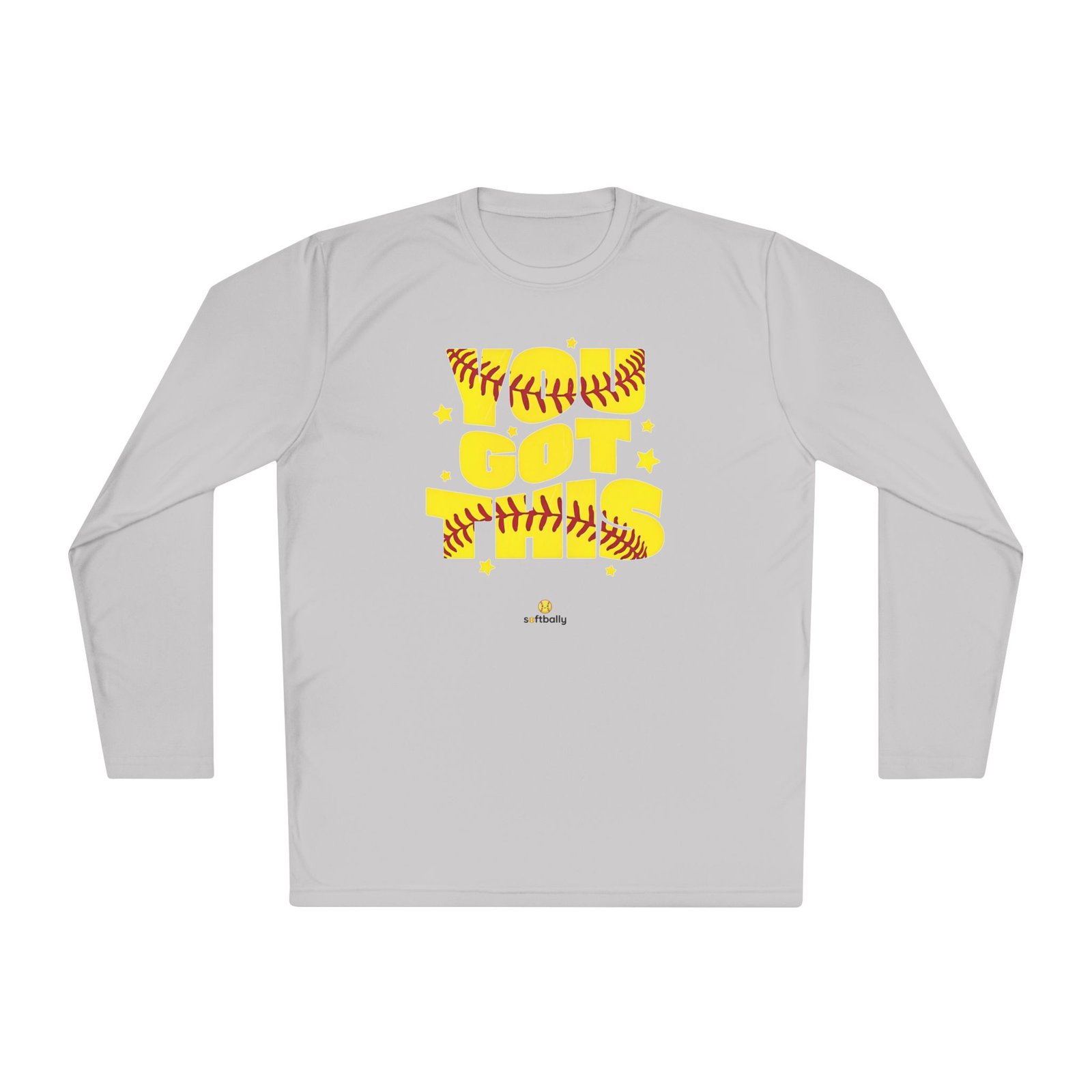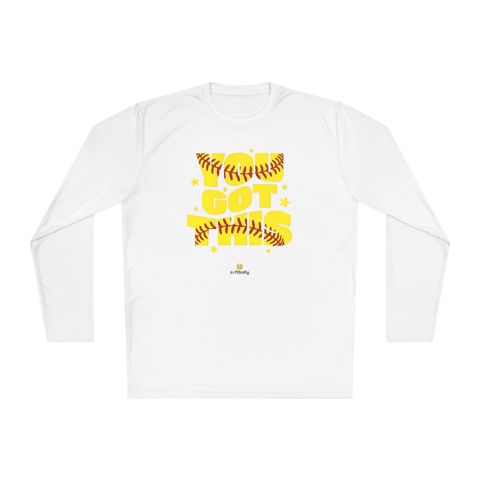 Lightweight and sporty, this unisex-fit long sleeve tee brings game-day energy to everyday wear. The bold yellow DTF graphic—woven with softball stitching and playful stars—reads like a cheer from the dugout. The airy 3.8 oz polyester feels barely there while the moisture-wicking fabric moves sweat away, so you stay cool during practice, runs to the field, or sun-drenched weekend tournaments. Double-stitched hems and a tear-away label keep the shirt comfortable and resilient through washes and play. Wear it layered under a zip hoodie or alone on warm afternoons; it moves with you and keeps the focus on the game.